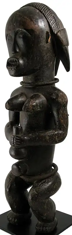One of the most popular art forms attributed to the Fang culture are the wooden reliquary heads, many of which contain the skull or bones of ancestors.[16] There is a characteristic heart-shaped, concave face and large bulbous forehead. The heads are very abstract and focus on geometric form and covered in a black patina. Some appear to 'cry', which is streaks of resin made from a mixture of palm oil and other seed oils. The heads are tied to the ideas of welfare and social power.
