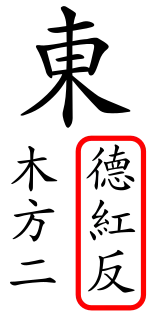 In the fanqie method, a character's pronunciation is represented by two other characters. The onset (initial consonant) is represented by that of the first of the two characters (上字 'upper word', as Chinese was written vertically); the final (including the medial glide, the nuclear vowel and the coda) and the tone are represented by those of the second of the two characters (下字, 'lower word').[2][11] For example, in the Qieyun, the character 東 is described by the formula 德紅反. The first two characters indicate the onset and the final, respectively, and so the pronunciation of 東 [tuŋ] is given as the onset [t] of 德 [tək] with the final [uŋ] of 紅 [ɣuŋ],[12] with the same tone as 紅.