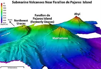 In the area of Farallón de Pájaros are two submarine volcanoes: The Makhahnas Seamount located about 10 km (6.2 mi) southwest, reaching a height of 640 m (2,100 ft) below sea level, and last erupted in 1967. The Ahyi Seamount located about 18 km (11 mi) south-east and reaches a height of 79 m (259 ft) below sea level.[6] It is associated with a possible eruption in 1979, an eruption in 2001, and a series of underwater eruptions from 24 April to 17 May 2014, with hydrothermal activity continuing at least to December 2014.[7]
