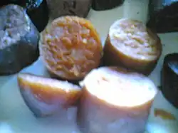 Although it resembles a chouriço or other meat sausage, its taste is not meaty; it is tangy (but not hot), with a doughy texture and has a somewhat sweet finish in the palate. It is never cooked sliced, unlike other sausages, since its dough-like content would pour out of the skin during cooking, except when fried, or deep-fried, as thick slices.