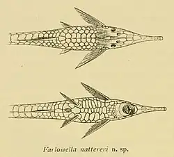Farlowella nattereri is a species of armored catfish of the family native to Bolivia, Brazil, Colombia, Ecuador, Guyana and Peru. It occurs in the upper Essequibo and Amazon basins. This species grows to a length of 26.5 centimetres (10.4 in) SL.