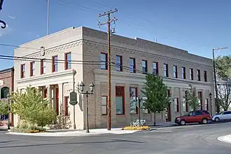 Farmer's Bank of Carson Valley (also spelled Farmers Bank of Carson Valley) is a historic bank building at 1597 Esmeralda Avenue in Minden, Nevada. It was built from 1916 to 1918 to replace the original 1909 bank building, which the Farmer's Bank had outgrown. Prominent Nevada architect Frederic Joseph DeLongchamps designed the building in the Classical Revival style; the bank is one of many Neoclassical structures in Minden designed by DeLongchamps. It features a cornice with terra cotta tiles and bands, a flat roof with a low parapet, and an entrance portico with Ionic columns. It was built for Farmer's Bank organizer H. F. Dangberg, who was also the founder of Minden.[2] It served as a bank until 1968; it currently houses offices.[3]