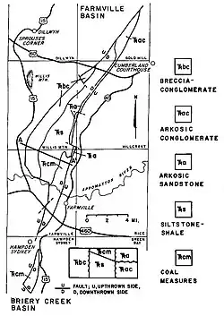 - ^ a b c Wilkes and, Gerald P. (August 1882). GEOLOGY AND MINERAL RESOURCES OF THE FARMVILLE TRIASSIC BASIN, VIRGINIA (PDF) (Report) (Vol. 28 Num. 3 ed.). Charlottesville, Virginia: Virginia Division of Mineral Resources. Retrieved 2016-08-08.
