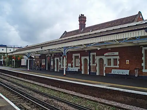 Farncombe railway station opened in 1897 as a minor stop on the Portsmouth Direct Line between Guildford and Godalming, England. It is said to have been built at the instigation of General Sir Frederick Marshall, a director of the London and South Western Railway Company, who lived nearby at Broadwater.[1]