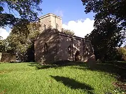 According to Kelly's Directory the church is "a small building of stone, in the Transitional, Early English and later styles, consisting of chancel, nave and a low western tower rising within the nave, and containing 3 bells : the south doorway is a rich example of the Transitional Norman style : a beautiful stained east window was presented by the late Mr. W. H. S. Adcock, of this village, one on the south side by the Rev. Greville Chester, late rector, and there are several other stained windows : in the chancel is a small brass to John Johnston, rector (ob. 1625), being then nearly 100 years old; and there are also inscriptions to the Clark, Adcock and Alderman families : the church plate includes an ancient chalice:there are 69 sittings. The register dates from the year 1587."[5]