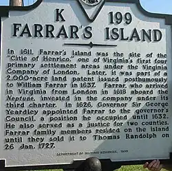 Due to its strategic location on the river, the peninsula's neck became the site of the earliest English settlements in Virginia, Henricus, founded by Sir Thomas Dale in 1611, but basically abandoned by 1622. Farrar's Island acquired its name after 1637 when William Farrar obtained ownership as part of the headright due him for importing indentured servants to the colony. Farrar was a lawyer who also served on the Virginia governor's council and as a magistrate in the Crown Colony of Virginia. The Farrar family owned the peninsula until 1737 when a descendant sold it to Thomas Randolph.