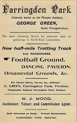 The Pleasure Gardens were purchased and renamed by George Green in 1901, taking on the name Farringdon Park, due to its origins being on the Farringdon Park Estate.[3] The football pitch was home to a team called Preston (not Preston North End) and the cycling track was used by Preston West End Cycling Club.[4] A pavilion was built in 1902 and the site was let out for fetes and galas over the following years.[5]