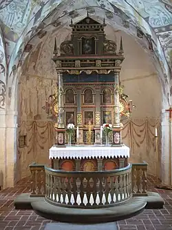 The choir of the church is profusely decorated with medieval murals. The apse wall displays Christ in Majesty surrounded by scenes from the Bible. On the wall separating the choir from the nave there are depictions of Saint Olaf and Saint Eric together with Christ crucified. The choir vault is decorated with a third set of murals dating from the end of the 15th century and made by the same artist who made the paintings in Everlöv Church. They depict scenes from the New Testament. Elsewhere in the church, fragments of paintings exist on the ground floor of the tower, including a possible depiction of Saint Catherine.[1][2]