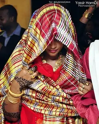 In western Sudan, particularly in Darfur and Kordofan, women wear the toub along with other colorful, layered garments. Fabric choices are adapted to the arid climate and social setting, ranging from lightweight cotton for everyday wear to more ornate fabrics for special occasions. According to local reporting, Fur, Masalit, Hausa, Nuba, and Fulani communities wear bold colors, layered wraps, embroidery, and henna-stamped patterns to express identity and style. Clothing remains a powerful symbol of pride, resilience, and femininity in these communities.[34][35][36]