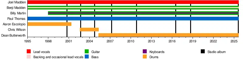 Good Charlotte is an American rock band formed in Waldorf, Maryland, in 1995. Since 2005, the band's lineup has consisted of Joel Madden (lead vocals), Benji Madden (guitar, vocals), Paul Thomas (bass), Billy Martin (guitar, keyboards), and Dean Butterworth (drums, percussion).