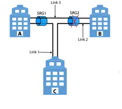 A cut in SRLG1 would be restorable using FASTAR if FASTAR is implemented in either office A or B but B and C were not yet FASTAR-compliant. But given a failure in SRLG2, the DS-3 traffic on link 3 would be restored by FASTAR via a newly re-computed backup path while the DS-3 traffic on link 2 would not be restored as FASTAR is not implemented in either office B or C. To restore all three links in the event of failure of both SRLGs, FASTAR is implemented in offices A and C. A failure in SRLG1 would cause FASTAR to automatically re-route each of the traffic on link 1 and 3 via two re-computed backup paths. Also if at another time failure of SRLG2 is detected, it is reported to RAPID and the traffic through link 2 and 3 are each re-routed through a new backup path.[10]