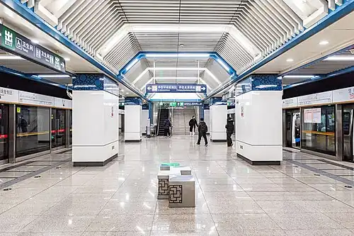 The station's platforms were completed on 28 December 2014, along with the rest of the initial section of Line 7, but, due to the need to clear space at the surface for station entrances, the station has remained unopened and trains pass through without stopping at Fatou.[3] In November 2017, the Beijing Municipal Commission of Housing and Urban Rural Development, and the Beijing Daily, both stated they expected the station to be operational by the end of 2018.[4][5] It was opened on December 30, 2018.[6]