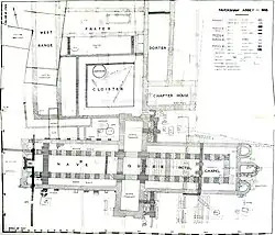 The Abbey was excavated in 1965 by a team led by the archaeologist Brian Philp.[4] A full plan of the abbey was produced. At around 360 ft (110 m) in length, the abbey was shorter than Canterbury Cathedral, but longer than Rochester Cathedral. The cloister and monastic buildings were built on the northern side.