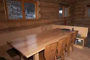The hut sleeps 12 in summer or winter on foam mattresses. It is equipped with both solar lighting and propane powered lamps. It has a propane stovetop and oven, and a wood-burning stove for heating in the winter.