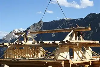 The new Fay hut was rebuilt by the ACC in 2005, close to the site of the original hut. Construction involved the contribution of hundreds of thousands of dollars, and thousands of hours of volunteer time, by the members of the ACC and its Rocky Mountain Section. The new hut was a modern log building, prefabricated outside of the park and airlifted to the site in 140 loads by two Bell 407 helicopters in June and July 2005. 20 volunteers a week worked on site for 4 weeks in July, 2005 to assemble the structure. There was one further week of work done in 2006 to finish some small items not completed the year before. In June 2005 85 flights were made to load most of the materials needed to complete the project. This was completed by several volunteers over a four-day period. In order for the actual construction to begin the site had to be cleared, a bridge built and a helicopter landing pad constructed.[7]