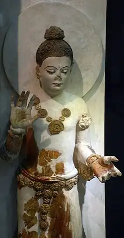 From the site were recovered numerous Buddhist frescoes and reliefs, now mostly located in the State Museum of History of Uzbekistan in Tashkent.[1] A famous niche showing the Buddha and two monks is dated to the 3rd-4th century CE.[14][15] An inscription has been found recently, which mentions the Kushan king Huvishka.[1]