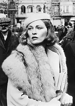 In 2011, a photo of Dunaway taken by Jerry Schatzberg in 1970 was chosen as the 64th annual Cannes Film Festival poster backdrop. The festival organizers described it as a "Model of sophistication and timeless elegance, it is an embodiment of the cinematic dream that the Festival de Cannes seeks to maintain".[33] During the festival, Dunaway and Schatzberg appeared at a special screening of Puzzle of a Downfall Child, earning a standing ovation upon their entrance. In 2013, Dunaway was the first recipient of the Leopard Club Award and made a rare personal appearance at the Locarno International Film Festival to accept it.[100] In 2014, Dunaway was recognized as the guest of honor by the Lumière Film Festival. Organizers praised the "immense contribution she has made to the emergence of the independent American films of the '60s and '70s, and the contribution is of the highest caliber".[101] Her attendance at the festival was described as an "exceptional event". Dunaway received a standing ovation by a crowd of 5,000, and declared in an emotional speech following the tribute she received, "My fans and my friends have supported me in this search for all these years, and I thank you from all of my heart, and without you, I would not be the same Faye Dunaway."[102] In 2014, Dunaway had to pull out of a French drama called Macadam Stories, in which she was going to play the lead, due to health issues, and was replaced by Isabelle Huppert.[103] The following year, it was announced that Dunaway was writing a book about her experiences making Mommie Dearest, but the project never materialized.[104]