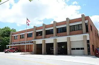 The Fayetteville Central Fire Station is a historic fire station at 303 West Center Street in Fayetteville, Arkansas. It is a two-story masonry structure, built out of brick in 1963 to a design by local architect T. Ewing Shelton. Its front facade is divided into seven sections by protruding brick piers of contrasting color, the outermost bays being very narrow. The right four main bays are occupied by equipment bays on the ground floor, and the bay to their left is large, with further subdivision into three on the second floor and fifteen narrow bays on the first. The station is significant as a high-quality local example of Mid-Century Modern design, and for its exemplification of the community's growth in the mid-20th century.[2]