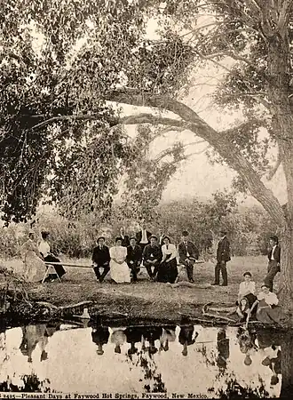 By 1900, it was developed by three men: J.C. Fay, William Lockwood, and T.C. McDermott. Fay and Lockwood's names were combined to create the "Faywood" name. McDermott was the only partner to remain at the resort.[1] The Faywood Hot Springs Hotel, which could serve up to 125 guests, was one-storied, with a three-sided courtyard and an almost 900 feet (270 m) long veranda.[7][4] The hotel had a large dining room, parlors, a writing room, barber shop, gun room, and a billiard room. Spring water was cooled and piped into the hotel rooms and bath houses.[4] Guest rooms had outdoor entrances and large windows, hot and cold water, and many rooms could be heated by piped water from the thermal springs.[7][4] In 1904, in a report by the Governor of New Mexico to the Secretary of the Interior, Faywood was identified as one of the more popular hot springs sites with "excellent hotel accommodations."[9] McDermott lived on the property until 1947, when he died at the age of 97. The resort was popular during World War I, but patronage later declined. In 1952, the hotel was demolished,[1] except for the adobe foundation.[7]