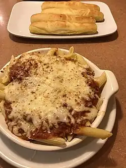 As of 2016, Fazoli's menu includes baked pastas, sandwiches, salads, parmigiano, meatballs and pizza.[15] Some restaurants offer a catering menu for collection or delivery.[16]
