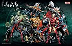 "Fear Itself" is a 2011 crossover comic book storyline published by Marvel Comics, consisting of a seven-issue, eponymous miniseries written by Matt Fraction and illustrated by Stuart Immonen, Wade Von Grawbadger, and Laura Martin, a prologue book by writer Ed Brubaker and artist Scot Eaton, and one hundred and sixteen[2] tie-in books, including most of the X-Men family of books.