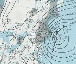In 1982 and 1983, a strong El Niño occurred, including on the dates during the blizzard's occurrence, which led to above-average temperatures across the northern United States and a cooler and wetter weather pattern across the South.[4][5] On February 9, a low-pressure area formed, centered over eastern Texas and along the Texas-Gulf of Mexico coastline.[6][7] It then progressed eastward across the Gulf the next day before moving across the Southeastern United States and emerging in the Atlantic Ocean off the Georgia-Florida coast.[6][7] The low-pressure system then intensified and fully developed into a cyclone as it approached Cape Hatteras, North Carolina.[6][7] As the cyclone moved northward along the East Coast of the United States, snow fell across the Mid-Atlantic beginning on February 11, with some areas experiencing blizzard conditions.[1][8] The cyclone then produced snow and blizzard conditions across portions of the Northeastern United States and New England regions, continuing to intensify as its pressure dropped to 1003 millibars by February 12.[7][1][9] The low's pressure continued to drop on that day while reaching portions of southern New England[6] before tracking offshore northward off the New England coast.[10] The blizzard was nicknamed the "Megalopolitan Blizzard" after the system hit numerous metropolitan areas along the East Coast of the United States with 30–75 centimeters (12–30 in) of snow.[11][12]