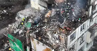 On 1 February 2025, at 7:44 am, during the Russo-Ukrainian War, a Russian missile exploded above an apartment building in Poltava which killed 15 civilians;[1] including two children, while a further 17 were injured; including four children.[3] Poltava was 240 kilometres (150 mi) away from the battlefront during the strike.[2][4][5] The missile, believed to be a Kh-22 supersonic cruise missile,[3] struck the west wing entrance of the apartment building, suspending the fourth and fifth floor, collapsed. The explosion shattered 1,500 windows, affecting buildings up to 270 metres (890 ft) away, a combined 308 households accommodating 528 residents.[1] A fire started on the damaged floors shortly after the explosion.[3] A kindergarten and parts of energy infrastructure in Poltava were also damaged.[6]