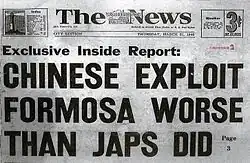 27. ^ Durdin, Tillman (March 29, 1947). "Formosa killings are put at 10s 1000s". The New York Times. Archived from the original on April 24, 2006. Retrieved April 22, 2006.