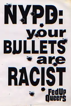 Fed Up Queers, or FUQ, was a queer activist direct action group that began in New York City. The group was made up mostly of lesbians such as Jennifer Flynn (who later co-founded the New York City AIDS Housing Network as well as Health GAP), though notable participants also included gay rights pioneer and Stonewall riots veteran Bob Kohler,[1] and writer Mattilda Bernstein Sycamore. The activists who formed FUQ came together loosely for a few actions in 1998, but the first action attributed to Fed Up Queers was on World AIDS Day, December 1, 1998, when they visited New York State Assemblywoman Nettie Mayersohn's house in Queens at midnight to protest her stance on names reporting.