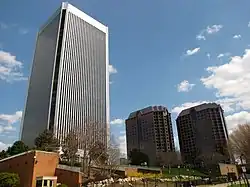 The current building, in the Central Office District, has an aluminum facade and was designed by Minoru Yamasaki, who also designed the former World Trade Center.[4] Despite being one of the tallest buildings in the state, 49% of the building's total floor area is located underground.[4] The building was proposed in 1972, and built from 1975 to 1978.[4]