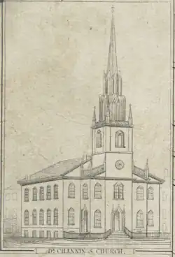 William Ellery Channing, (1780–1842), often known as "The Father of American Unitarianism", served as Senior Minister at the Federal Street Church from 1803 to 1842. Under his leadership the congregation prospered. To accommodate the crowds that Channing drew, the third meeting house, designed by the noted architect Charles Bulfinch, was built in 1809 on the Federal Street site.[6] At the time, Bulfinch's design received mixed reviews. "The lightest and most graceful steeple in Boston is in Federal Street, of the Gothic order. We believe the Federal Street Church is the first attempt at this style of architecture in Massachusetts, and one of the first in the United States. It has great faults, and, indeed, few merits except the steeple."[7]