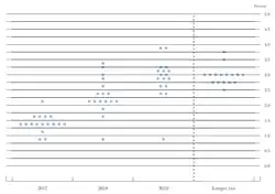 In the 2010s, the Federal Reserve Open Market rate-setting committee (FOMC) began publishing dot plots to tabulate all individual committee member projections of target interest rates in a single graphic.[8] In 2016, the president of the St. Louis Fed James Bullard began a movement away from the dot plot exercise, citing a gap of opinion between market economists and FOMC members.[23] As of 2018, the FOMC has continued to publish dot plots in its economic projections, detailing the variety of opinions of the committee members for the "appropriate target range for the federal funds rate" in future years.[24]