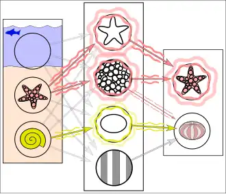 Subsequent run of the network on an input image (left):[1] The network correctly detects the starfish. However, the weakly weighted association between ringed texture and sea urchin also confers a weak signal to the latter from one of two intermediate nodes. In addition, a shell that was not included in the training gives a weak signal for the oval shape, also resulting in a weak signal for the sea urchin output. These weak signals may result in a false positive result for sea urchin.