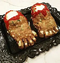 Feetloaf is a novelty dish intended to be served on Halloween. The earliest known reference is a 2009 cooking blog which was based on a recipe found in a seasonal cookbook sold at a grocery store checkout counter. The original recipe described a meatloaf molded into the shape of a human foot, using brazil nuts as toenails and ketchup or barbecue sauce to mimic blood.[1]
