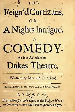 - ^ Behn, Aphra (1679). "The feign'd curtizans, or, A nights intrigue. A comedy. As it is acted at the Dukes theatre. Written by Mrs. A. Behn". This Item is from the Stockton Axson Collection of 18th Century British Drama, Woodson Research Center, Rice University. hdl:1911/61555.