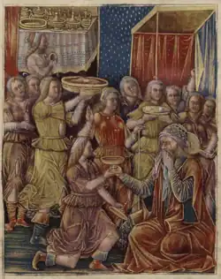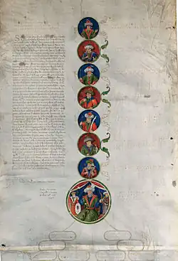 The Genealogia is preserved in two redactions. The first and longer is preserved in two manuscripts, including Cuspinian's copy from the 1520s. The abridged second redaction is known only from the illustrated dedication copy in the form of a roll made for Vladislaus II in 1502, now Lat. 378 in the National Széchényi Library.[24] The second redaction includes a short section on Ottoman laws and customs, which is the only place in his works that he discusses Islam in any depth, commenting on jihad, ritual ablution, abstinence from alcohol, virgins in heaven, the call to prayer and Ramadan ending in Bayram.[23] The roll is commonly assumed to have been the work of Petančić himself.[25]