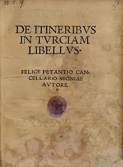 The Quibus itineribus Turci sint aggrediendi ("The Routes By Which the Turks Should Be Attacked") is attributed to Petančić in the first edition published at Vienna by Johannes Cuspinian in 1522 under the title De itineribus in Turciam libellus Felice Petantio cancellario Segniae autore.[19] It was published 23 times down to 1664.[20] No manuscript earlier than the first printing is known. All surviving manuscript copies are based on the printed text. It was a popular work. A German translation was on its third printing in 1558, an Italian translation survives in manuscript from the sixteenth century and Serbian and Croatian translations were published in the nineteenth century.[19]