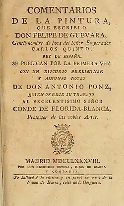 His work remained as a manuscript until it was published in 1788 by Antonio Ponz. Sánchez Cantón felt it was probably written around 1560, shortly before his death. In his "Commentaries" Felipe devotes a section to fresco painting, the grotesques, painting on canvas, encaustic, lighting, mosaics, and oil. He refers to the writings of Pliny the Elder regarding the invention of painting in encaustic by Aristides (although Guevara believes that it was used previously), and its perfection by Praxiteles. He also credits the ancients with the invention of oil painting, a technique that in the sixteenth century was considered of recent origin. The most interesting chapter of Guevara's work is about fresco and stucco decoration, which steps through the implementation process and the materials used at the time. Although it refers to the text of Vitruvius, this source is continuously compared with traditional uses of Spain, making the passage a document of the first order for this technique, popular in the 16th century.