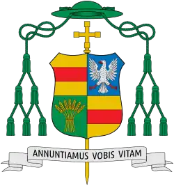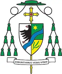Upon being made a bishop, Genn took up an episcopal coat of arms. Upon being made Bishop of Münster, he adopted a new coat of arms. On his current coat of arms, the yellow and red striped fields on the top left and bottom right of the shield are taken from the Diocese of Münster's coat of arms. The eagle in the top right field is indicative of Genn's hometown of Wassenach, as an eagle is present in its coat of arms, and is a remnant of his previous coats of arms as Bishop of Essen and Auxiliary Bishop of Trier. Moreover, the eagle relates to his Latin episcopal motto, Annuntiamus vobis vitam, which is taken from 1 John 1, 1–4.[9]