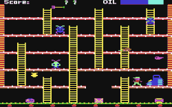 After crossing the conveyor belt, Felix can climb into the rest of the factory which contains a number of randomly placed items which can be picked up and used as well as a number of enemies. The main enemies are the various gremlins that patrol the platforms. If they come into contact with Felix, they knock him off the platform and a life is lost. The other hazard is a giant rat which occasionally runs across the screen, again knocking Felix off the platform (although unlike the gremlins, it can be jumped). Felix can collect a pitchfork which lets him run at the gremlins and knock them from the platforms. This only lasts for a brief time (like the axe in Donkey Kong). There is also a bag of rat poison which can be collected and then laid down on a platform in the hope that the rat will run across that platform. Finally, Felix can collect an oil can which he must take back to the generator. If the can is dropped (by running into a wall or falling on the conveyor belt), it spills and he must return for another can. Only one item can be carried at a time.