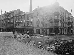 Construction on the central parts of the tunnel started in 1912. At the time, an agreement had not been reached with the municipality about the location of the terminus.[9] In October, there was a landslip at Valkyrie plass, resulting in a cavity.[10] Thirty properties sustained cracks and other damage, and the owners threatened Holmenkolbanen with a lawsuit to reclaim the cost of repairs.[10] By October 1914, the tunnel works had been completed from Rosenborggaten to the statue of Karl Johan in the Palace Park (Slottsparken). The issue of the terminus was still not resolved, and work was therefore halted. Holmenkolbanen were planning on building the line through the city center, and therefore wanted the terminus at Fredriks gate, while the municipality wanted it at Ruseløkkveien.[9]