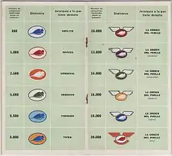 Upon joining one was issued with an official booklet which contained: one's name and Fellowship Number for accounting purposes; information on how the fellowship worked; how to make the salute for greeting "fellow bellows" (upward spiral motion of first finger of right hand depicting an eddy of wind); tear-out slips for handing in with contributions so that it could be recorded by the servants (receipts were given); a chart on the back page for monitoring one's own progress towards promotion. The Fellows were encouraged to continue to contribute because after 1,000 planes had been certified by the Air Ministry and paid for, the Fellow was promoted from PUFF (Soplito) to GUST (Rafaga) and given another distinctive badge. And so the quest for funds through fun went on: with 2,500 planes down and paid for, the GUST became a GALE (Vendaval); 5,000 planes created a HURRICANE (Huracán), 6,500 a TORNADO (Tornado) and 8,000 a TYPHOON (Tifón). With each promotion, a further distinctive badge was issued. 10,000 planes downed and paid for entitled Fellows to obtain the honour: THE ORDER OF THE BELLOWS and were given their wings; wings were added to a special badge depicting a bellows. It was a further masterstroke that the incentive of promotion encouraged continuing monthly payments.