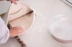 In the wet felting process, hot water is applied to layers of animal hairs, while repeated agitation and compression causes the fibers to hook together or weave together into a single piece of fabric.[15][9] Wrapping the properly arranged fiber in a sturdy, textured material, such as a bamboo mat or burlap, will speed up the felting process. The felted material may be finished by fulling.