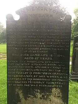 When Carr died the financial problems of the church caused it to collapse. Martha Williams wrote her biography the same year as Memoirs of the life and character of Ann Carr: containing an account of her conversion to God, her devoted labours and her happy death.[7] The monument that was placed on her grave recording her as the "Foundress of the sect of Female Revivalists" was recognised as part of a listed monument in Leeds in 1976. It is one of a number preserved in the remains of Woodhouse Cemetery[8] in what is now the grounds of Leeds University.