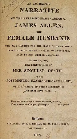 In 1829 it was reported that another female husband, James Allen, had successfully lived as a man without facing prosecution for 21 years.[8][9][10] Allen had married Abigail (née Naylor) in 1807 at St Giles' Church, Camberwell.[11] It was only under autopsy at St Thomas' Hospital, London, that his sex was discovered to be female.[12] Abigail said she "was not suspicious of her husband's sex because Allen was uncannily strong". Jen Manion speculates that as Abigail was threatened by her neighbours, she felt that the only way they would leave her alone would be to swear she had no idea.[13] A sensational pamphlet purported to provide the public with "An Authentic Narrative of the Extraordinary Career of James Allen, the Female Husband [...]".