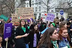 In the 2000s, some feminist groups such as Ni putes, ni soumises (Neither Whores, Nor Submissives) denounced an increased influence of Islamic extremism in poor suburbs of large immigrant population, claiming they may be pressured into wearing veils, leaving school, and marrying early.[33] On the other hand, a "third wave" of the feminist movement arose, combining the issues of sexism and racism, protesting the perceived Islamophobic instrumentalization of feminism by the French Right.