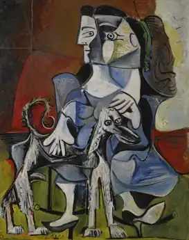 Femme au Chien (English: Woman with dog) is an oil-on-canvas painting by Pablo Picasso, which he painted in 1962. It is a portrait of Picasso's second wife, Jacqueline Roque, and their dog Kaboul, an Afghan Greyhound. The painting is an illustration of the great affection that Picasso displayed for both of the subjects in the portrait and has elements of the cubist style that he pioneered. It was produced in Picasso's later years when the couple was living at Notre-Dame-de-Vie, near Mougins, France. On 14 May 2019, it was sold at Sotheby's auction for almost $55 million and is now housed in the collection of Wynn Fine Art in Florida.