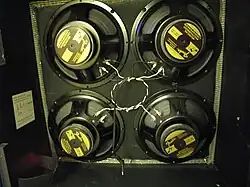 The Fender Hot Rod DeVille is a combo tube guitar amplifier manufactured and sold by Fender. It was introduced in 1996 as part of Fender's Hot Rod line of amplifiers, and since then has been in continuous production. The Hot Rod DeVille is a modified version of the earlier Fender Blues DeVille from the Blues amplifier line and has a higher level of gain in its preamplification signal. The DeVille incorporates a 60 watt amplifier and has been offered in two different models: a 212, with 2, 12-inch speakers and a 410, with 4, 10-inch speakers. The 410 utilized 10" Fender Special Design speakers made by Eminence and was available for versions II and III. The 212 has been available through versions II, III and IV. The 212 has offered the following speakers: 12" Fender Special Design by Eminence for version II, 12" Celestion G12-P80 for version III, and 12" Celestion A-Type for version IV.[1][2] Fender described version III as incorporating modifications to the preamp to provide the drive channels with "more modern distortion," switching to Celestion speakers for the 212, and changing the control panel from chrome to black, for better visibility on stage. Fender described version IV as incorporating modifications to the preamp to provide the drive channels with "better definition of the notes," changing the type of Celestion speaker, and modifying the reverb unit to provide "smoother" and more controllable reverb. The DeVille is the sister amplifier of the Fender Hot Rod Deluxe.