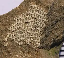 Fenestellidae is a family of bryozoans belonging to the order Fenestrida. The skeleton of its colonies consists of stiff branches that are interconnected by narrower crossbars (or dissepiments). The individuals of the colony (or zooids) inhabit one side of the branches in two parallel rows or two at the branch base and three or more rows further up. Zooids can be recognized as small rimmed pores (or apertures), and in well-preserved specimens the apertures are closed by centrally perforated lids. The front of the branches carries small nodes in a row or zigzag line between the apertures. Branches split (or bifurcate) from time to time giving the colonies a fan-shape or, in the genus Archimedes, create an mesh in the shape of an Archimedes screw.[1]