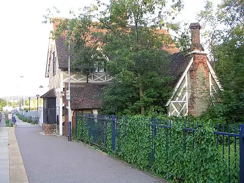 Opened in 1846 by the Bedford Railway,[1] Fenny Stratford station is just over 1 mile (1.6 km) from Bletchley. The station buildings are in a half-timbered Gothic Revival style that had been insisted upon by the 7th Duke of Bedford for stations close to the Woburn Estate. The buildings are now residential and Grade II listed.[4] West of the station is Watling Street, which was raised by some 6 feet 8 inches (2.03 m) to allow the railway to pass beneath; immediately west of Stag bridge in the direction of Bletchley are points leading onto the disused freight-only railway line toward Oxford via the Bletchley Flyover. The passenger line and station are protected here by trap points, but they are sited such that any runaway train caught by it would subsequently crash into the bridge.[5]
